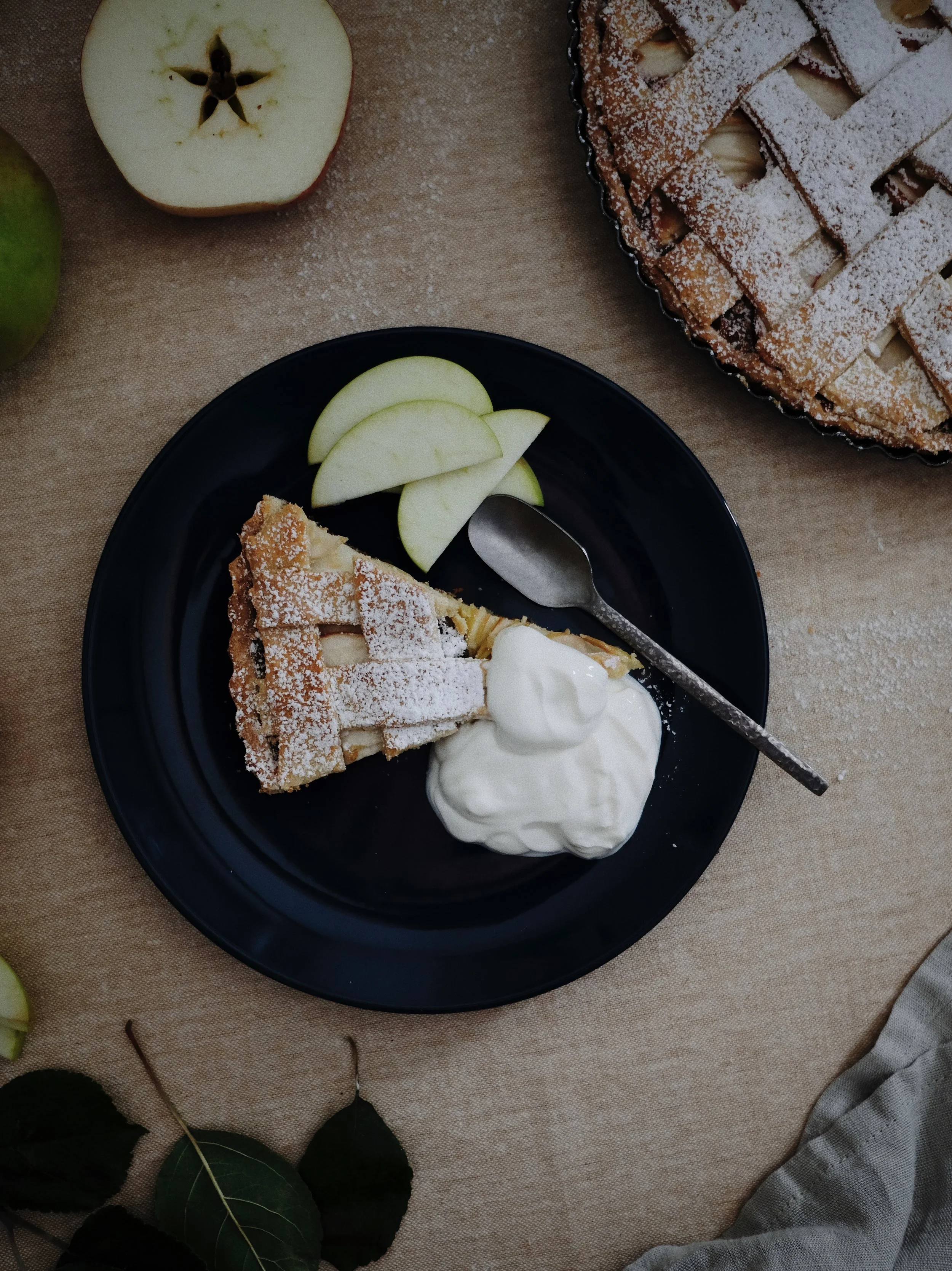 Server den flotte æbletærte lun, drysset med flormelis og en skefuld creme fraiche til.