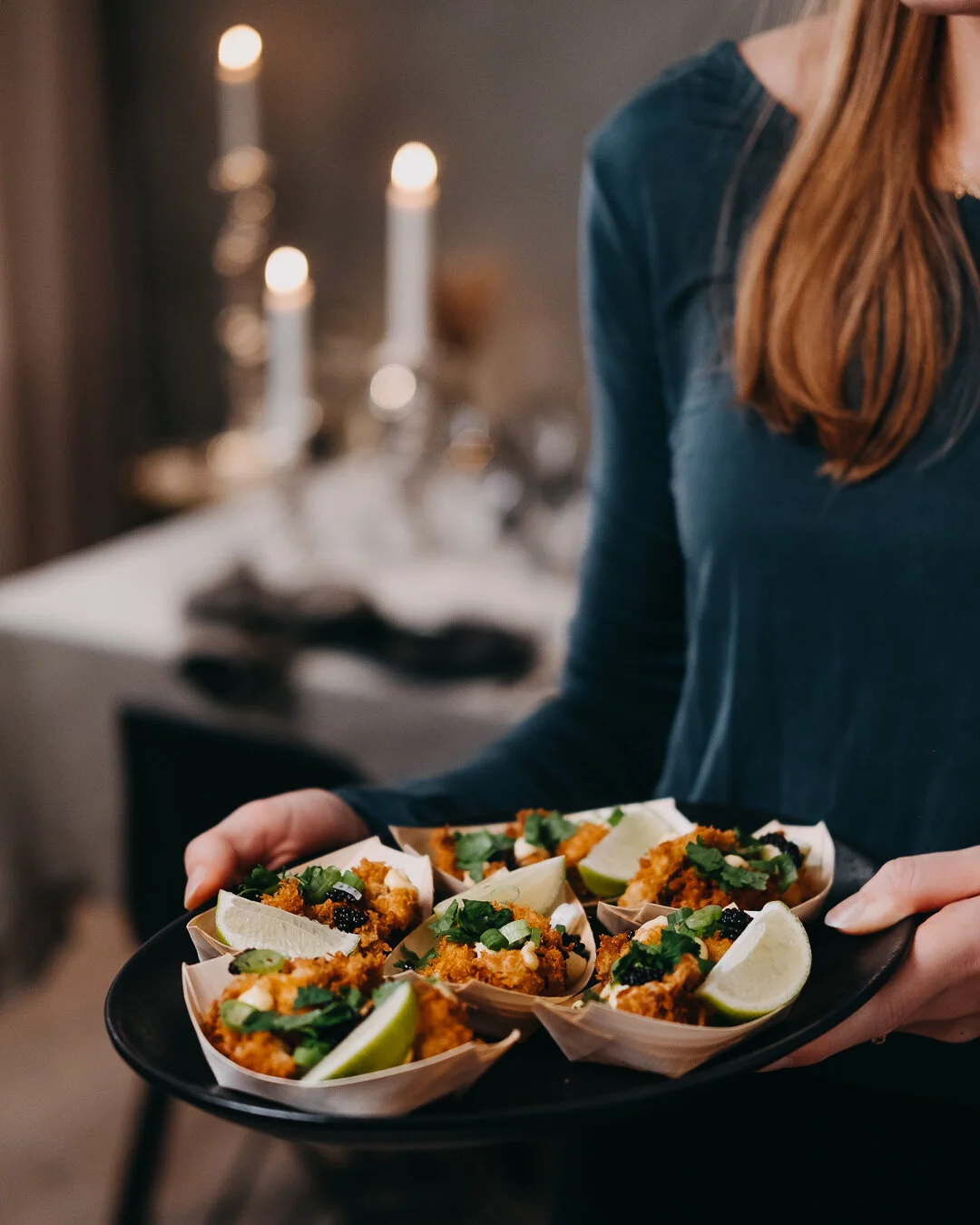 Her får du opskriften på friterede østershatte serveret med kaviar, forårsløg, japansk mayonnaise og koriander. Den perfekte velkomst-hapser, serveret under dronningens nytårstale. Du finder opskriften på en variant med østers her.